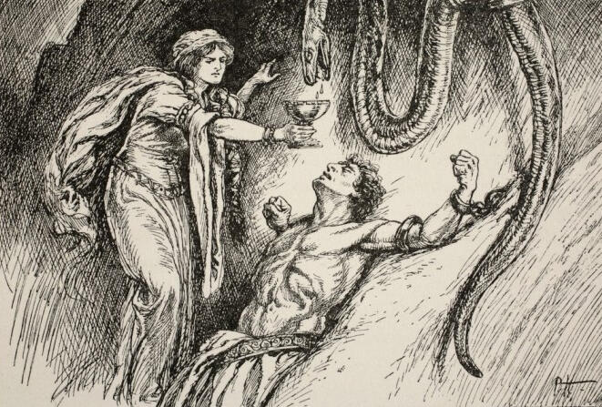 Skadi placed a snake on the rock above Loki’s head and let the venom of the snake drip into the face of Loki. Only the faithful wife of Loki, Sigyn, dared to stay with Loki in the dark cave.